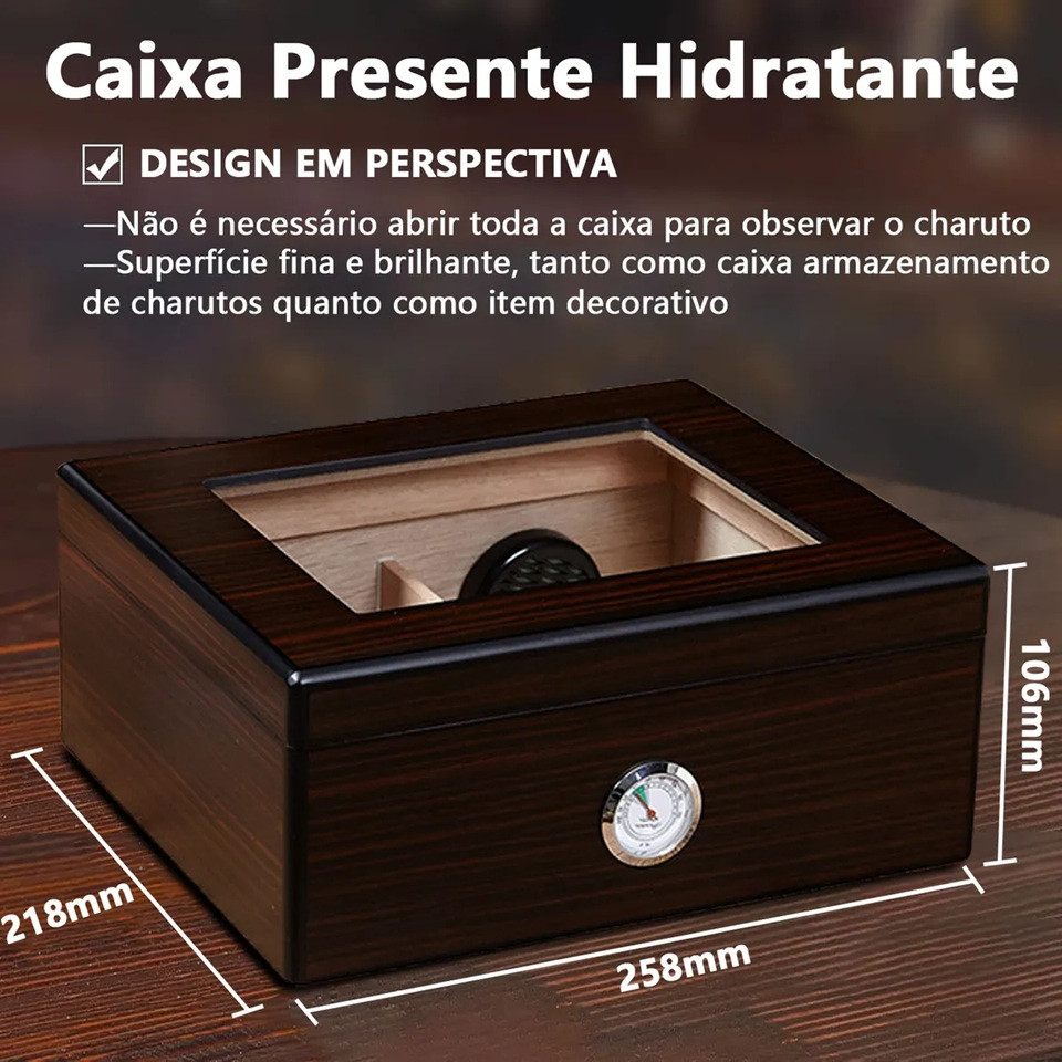 HIGRÔMETRO e UMIDIFICADOR: A caixa do umidor de charutos é equipada com o equipamento de umidade correspondente, o que facilita a observação da umidade do charuto. Quando a umidade for insuficiente, injete o líquido umidificador diretamente no umidificador.